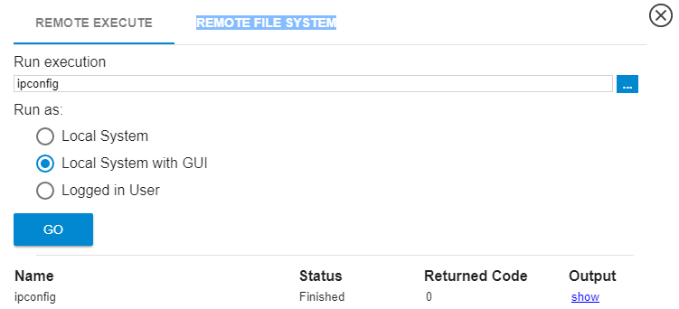 When you execute a file, the RCViewer application shows the execution status. If the execution captured a result, click Show to see it. The execution status history is cleared when the session closes.
