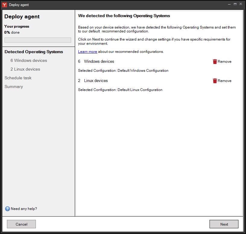 The detected operating systems page shows you the detected operating systems, sorted by agent type required. Click Remove if you don't want to deploy an agent type right now.