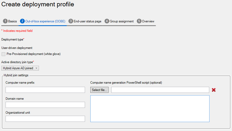 - On the Out-of-box-experience page, select Hybrid Azure AD joined under Active directory join type.