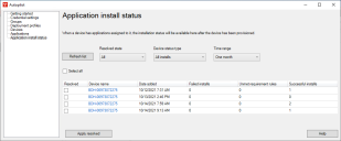 The application install status page shows application installation success/failure information for each device. Clicking an installation in this list shows detailed install information that may help with troubleshooting.