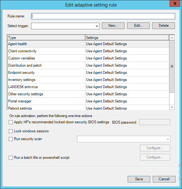 Clicking New or Edit in the Adaptive settings dialog box shows the Edit adaptive setting rule dialog box. An adaptive settings rule associates a trigger with one or more agent settings to override when the trigger activates, along with additional one-time actions, such as locking the screen.
