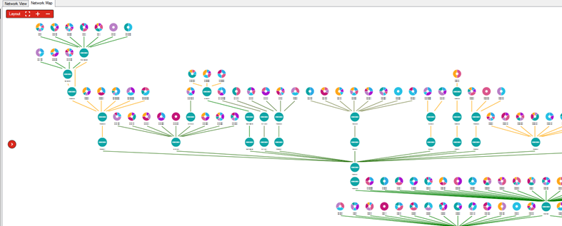 The console coalesces the traceroute data and draws a map of all subnets and intermediate nodes. Each node on the map's top level is a subnet or switch. If there are devices with agents behind those nodes, the node is represented as a color-coded pie chart. The pie chart shows the percentages of different device types behind that node, such as Windows, Apple, and so on. The connection line color indicates the ping response time.