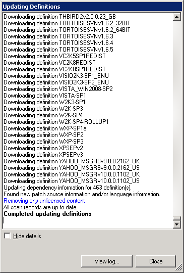 9.To download the content now, click Update Now. The Updating Definitions dialog box displays the current operation and status. If you click Cancel or close the console before the update is finished, only the security content that has been processed to that point is downloaded to the core database.