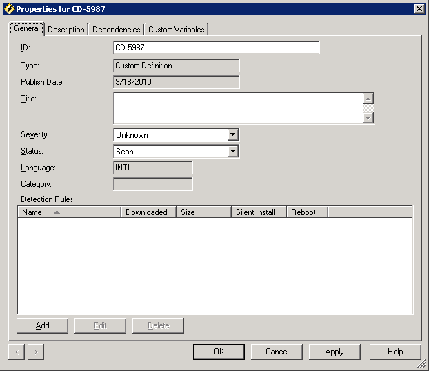 11.The Detection Rules list displays all the rules used by this vulnerability. If you're creating a new custom vulnerability, configure at least one detection rule that is used by the security scanner to scan devices for the vulnerability. To add detection rules, click Add. (See the procedure below for instructions.)