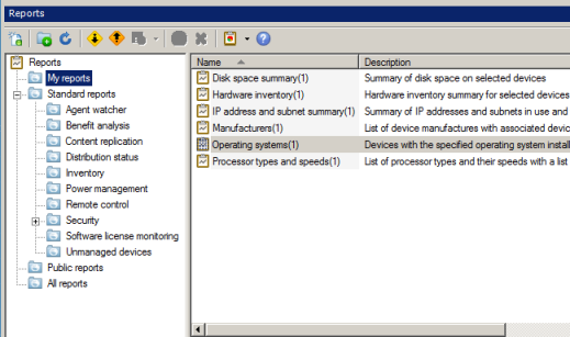 - Standard reports: Predefined reports that are installed with Endpoint Manager. The reports are preformatted, have query properties and chart types assigned, and are ready to be used.