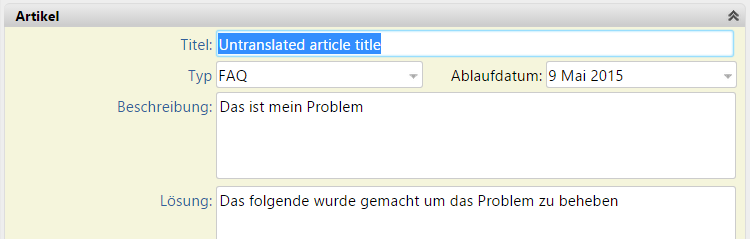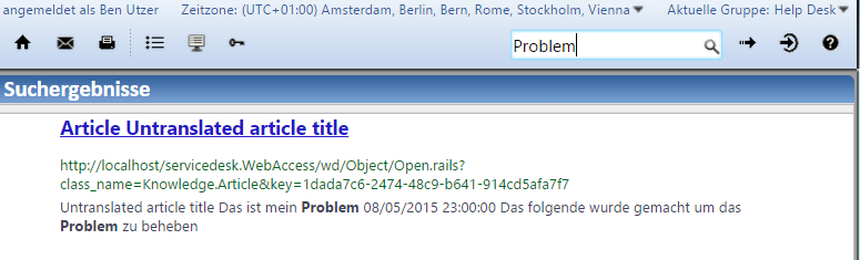 If a German-speaking user logs in, they can search for knowledge in German and find the same articles but with German translations where they have been provided. If a string has not been translated, it appears in the default language - in this example, English.