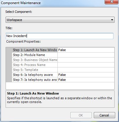 The Component Maintenance dialog appears. - In the Select Component list, select the required component. For example, if you want to add a shortcut to logging a new Incident, you would select Workspace.