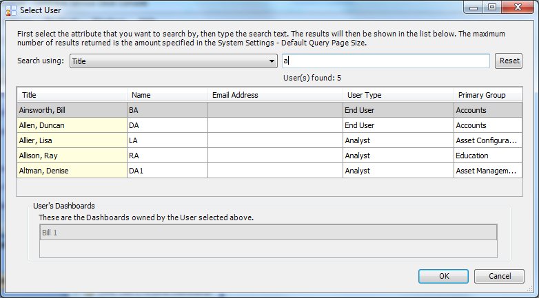The Select User dialog appears. - In the Search using list, select the attribute that you want to search by, then in the next box, start typing the value you are searching for.