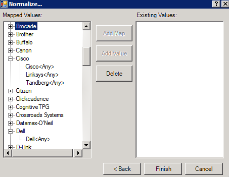 Panel de valores asignados: Muestra una lista de valores nuevos y normalizados, que se utilizará para este atributo específico. Esta lista está vacía hasta que se selecciona un valor existente y se haga clic en el botón Agregar asignación para trasladarlo. Cuando el valor esté en esta lista, se podrá normalizar agregando un número de valores que sean variaciones de su nombre.