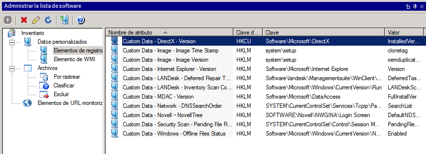 Gestionar la herramienta Administrar la lista de software para configurar el software y los datos que desee incluir en los rastreos de inventario. Las opciones que se seleccionan con esta herramienta definen qué elementos se rastrearán cuando se ejecute el rastreador de inventario.