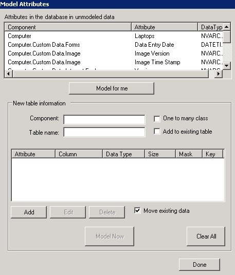 - Agregar a la tabla existente: Si ya existe una tabla para este componente, seleccione esta opción para agregar una columna nueva para los datos del atributo sin modelar.