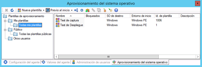 La barra de herramientas incluye botones para crear, modificar y administrar las plantillas de aprovisionamiento.
