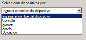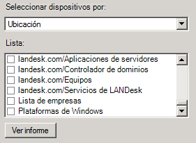 Por ejemplo, puede seleccionar dispositivos de una ubicación con base en la ubicación del dispositivo en la red. Cuando seleccione Ubicación, la lista mostrará las ubicaciones en la red ordenadas por nombre de dominio.