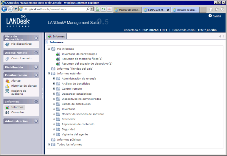 Cuando se utiliza la consola Web, los informes que se encuentran en la consola Windows estarán disponibles, pero hay pequeñas diferencias en la manera de ver y seleccionar los parámetros. No se pueden modificar o crear informes personalizados en la consola web o mover informes entre carpetas, pero sí se pueden ejecutar, imprimir y exportar informes.