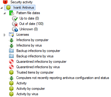 La herramienta de Actividad de seguridad (Herramientas > Seguridad y cumplimiento > Actividad de seguridad) proporciona una conveniente ventana individual donde puede ver el estado y la información de actividad de varios servicios de Ivanti® Endpoint Security para Endpoint Manager que se ejecutan en los dispositivos administrados.