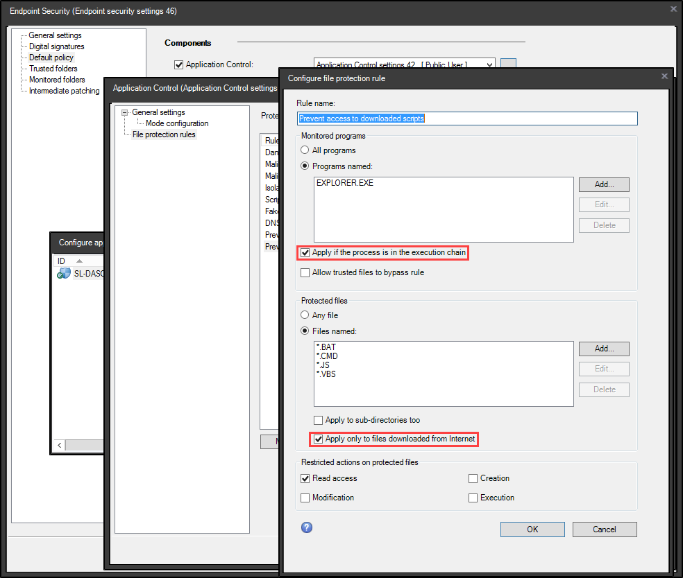 En la versión 2017.1 se han agregado dos nuevas opciones a las reglas de protección de archivos para ayudar a bloquear a los usuarios que estén ejecutando secuencias de comando de un explorador o de una aplicación de correo, aunque las secuencias de comando se hubieran descargado dentro de un archivo comprimido.
