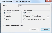 El cuadro de diálogo Conversiones de atributo predeterminadas cambia según el tipo de datos que se van a transformar. Por ejemplo, si los datos son una cadena de texto o un número.