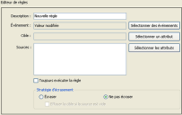 Les règles de copie vous permettent de demander que la valeur actuelle d'un attribut soit copiée dans un autre champ lorsqu'un événement spécifique se produit (lorsqu'un attribut change, par exemple). Vous pouvez configurer des règles de copie pour les événements suivants :