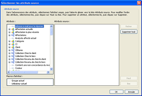 Vous pouvez sélectionner plusieurs attributs source. Toutefois, un seul est utilisé : l'attribut contenant une valeur situé le plus près du début de la liste Attributs source. Vous pouvez changer l'ordre de cette liste à l'aide des boutons Haut et Bas.