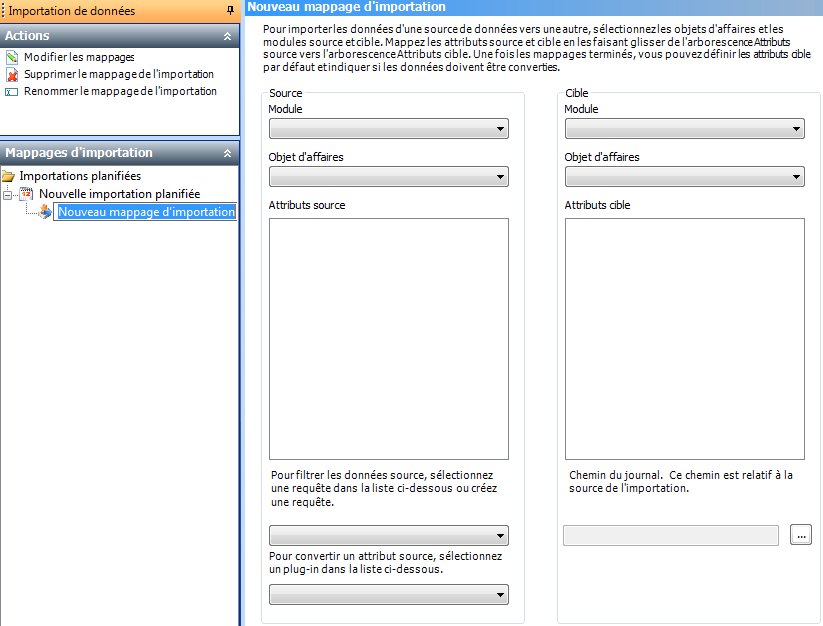 . - Dans l'arborescence Mappages d'importation, sélectionnez la planification que vous venez de créer, puis ouvrez la liste Actions et cliquez sur Nouveau mappage d'importation.