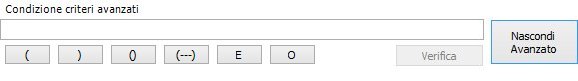 Premendo la barra spaziatrice nella casella Condizione criteri avanzati, apparirà un menu in cui verranno mostrate le opzioni disponibili. È inoltre possibile utilizzare i pulsanti sotto la casella Condizione criteri avanzati per costruire la propria espressione.