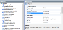 Aby wyświetlać wyniki zapytań w komponencie Web Access lub aplikacji Workspaces w postaci raportu, należy utworzyć szablon raportu dla obiektu, w oparciu o który działa zapytanie. - Kliknij nazwę obiektu u góry drzewa Atrybuty, a następnie obok pozycji Raporty w siatce Właściwości kliknij przycisk