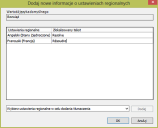 Zostanie wyświetlone okno dialogowe Dodaj nowe informacje o ustawieniach regionalnych. - Wypełnij okno dialogowe Dodaj nowe informacje o ustawieniach regionalnych w sposób poprzednio opisany, a następnie zapisz zmiany.