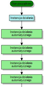 Działania automatyczne są krokami wykonywanymi automatycznie (bez interakcji z użytkownikiem) w celu przeprowadzenia procesu do kolejnego stanu. Na przykład można skonfigurować zadania pojawiające się automatycznie, gdy proces osiągnie pewien stan, lub można przypisać proces do konkretnej osoby.