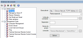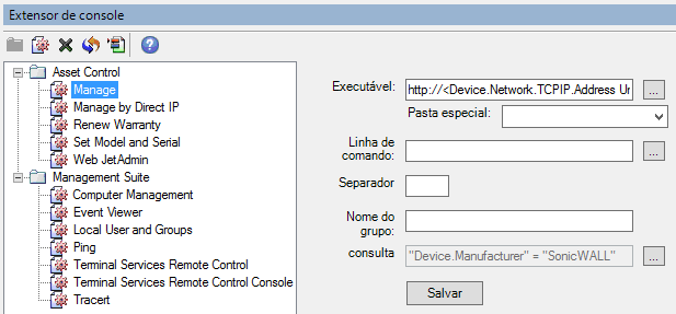 usar o Extensor de console é simples—expanda a pasta Asset Control ou Management Suite, crie um comando e defina seus parâmetros. Dependendo de qual pasta selecionar, o comando aparecerá como uma opção no menu do botão direito de dispositivos encontrados na tela do Asset Control ou na tela de rede do Management Suite.