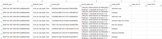 O arquivo contém uma linha para cada valor traduzível no banco de dados e as seguintes colunas: