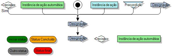 - Uma designação automática pode existir como o nó final de várias conexões. Esses podem ser a partir do ponto de início, decisões, pré-condições, ações ou ações automáticas.