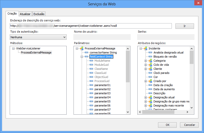 - Na lista Tipo de Autenticação, selecione o tipo de autenticação exigido pelo Site que hospeda o serviço web: Nenhum, Windows ou Básico.