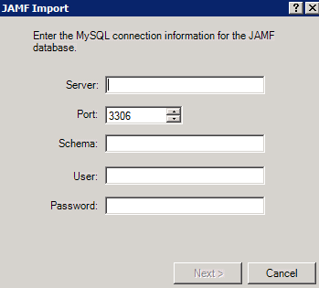 完成 MySQL 客户端安装之后,使用该页面将 MySQL 连接信息输入 JAMF 站点服务器数据库。