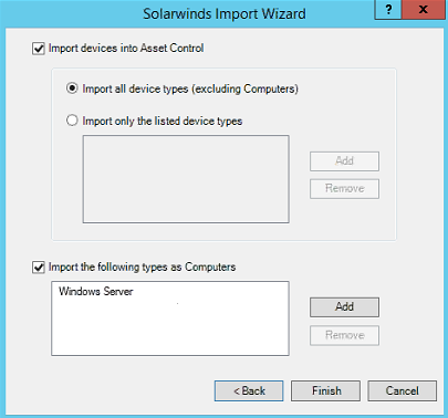 通过此页面,可以选择将您的 Solarwinds 设备数据同时导入到资产控制和清单,或者仅导入到这些数据库其中之一。