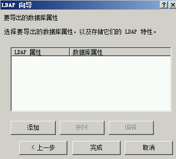本页面列出所有要导出的数据库属性,以及存储它们的 LDAP 属性。可以根据需要导出任意数量的属性。单击添加按钮在此列表中添加属性。