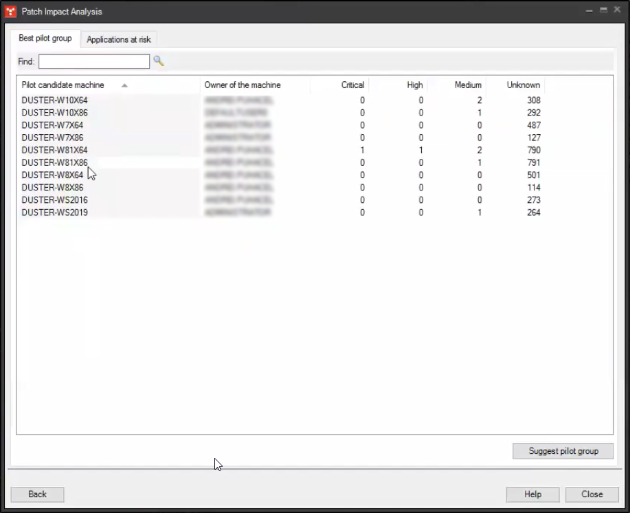 风险计算完成后,最佳试点组选项卡会显示所选设备中最有可能受到修补程序影响的设备。 在其他因素中,影响是按照受影响的文件或应用程序是否存在来计算。 基于分析结果,每个设备都会显示计算出的风险系数。 本节的后文中会介绍这些风险系数。