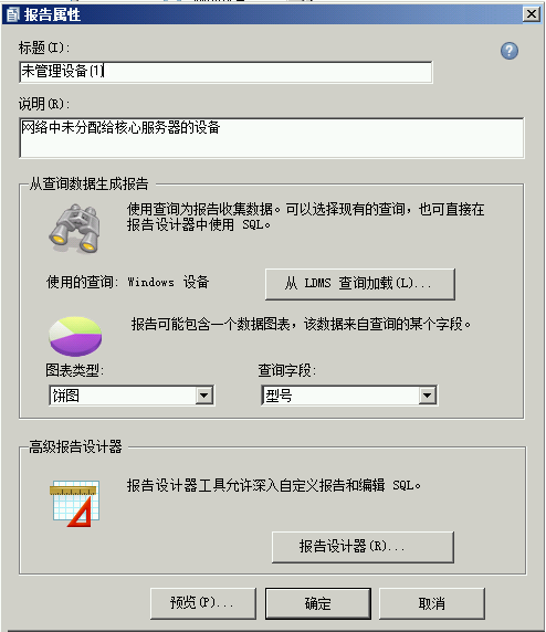 您可以制作预定义报告的副本,在报告属性对话框中修改项目。 您可以更改报告中显示的图表的类型,并将不同的查询字段指定为查询关键元素。 您还可以选择将 LDMS 查询用作报告基础。 同时,您还可以更改名称和描述。