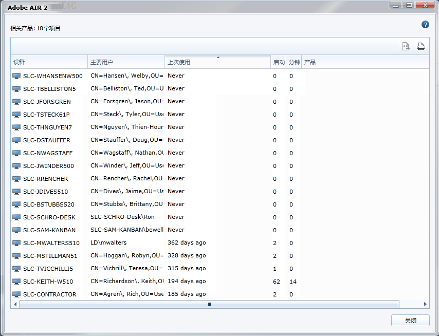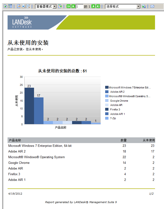 “顾问”框中包含数据时,单击数字打开数据源的全面报告。 在以上示例中,“顾问”报告从未使用的安装的数量。 单击绿色数字打开一个报告,其中显示该总计中计入哪些产品。