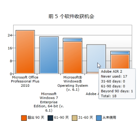 仪表板页面显示报告摘要,以及图表和顾问数据。 在以下示例中,图表显示收回(或称为“收获”)未使用许可证的五个最佳机会。 控制台底部的“顾问”框显示从未使用的已安装产品的总数。