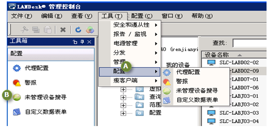 您可以通过“工具”菜单 (A) 和“工具箱” (B) 这两种方式来使用工具。 要启用工具箱,请单击视图 > 工具箱。 但是,如果要节省控制台中的空间,可选择不启用工具箱,只从“工具”菜单中选择工具。
