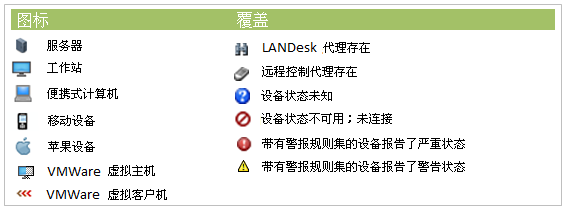 请注意:在网络视图中,结果列表中的每个项目旁边都会显示一个图标,此图标用于标识设备的类型。 单击设备图标后可能会在其上方或旁边显示一个很小的覆盖图案,这取决于是否已安装代理、当前连接的设备和健康状态等情况。