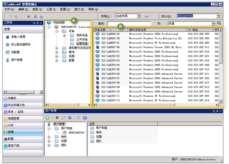 网络视图窗口始终是打开的,其中含有两个窗格。 左窗格 (A) 中显示当前连接的核心服务器、数据库及其设备查询配置组的层次结构树视图。 您可以根据需要展开或折叠这些树对象。 网络视图中的右窗格 (B) 显示选定的组项目的详细列表。