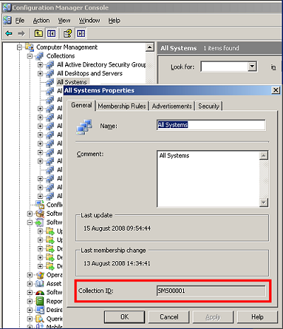 您可以通过查看 SCCM 配置管理器控制台中的集合属性来确定“集合 ID”。“集合 ID”显示在对话框底部。