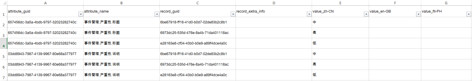 该文件包含数据库中每个可翻译值的行以及以下列: