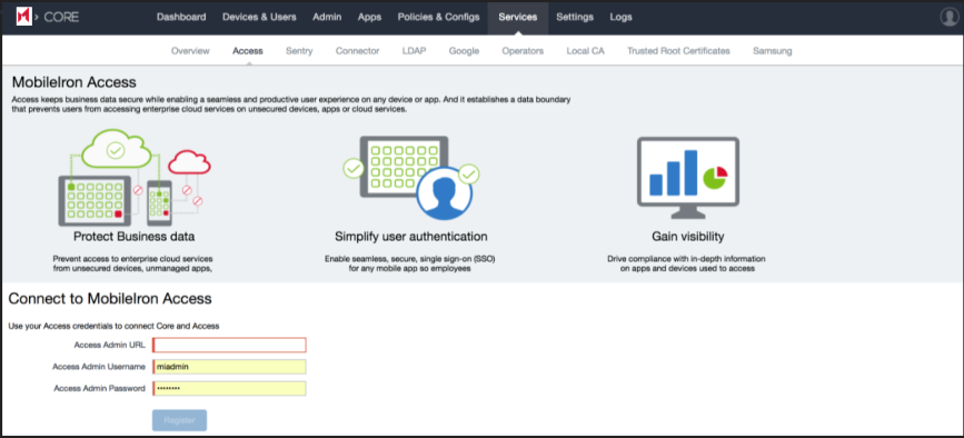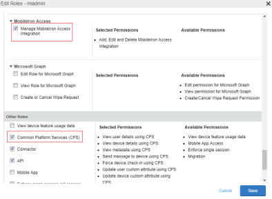 •Ensure that you have Manage MobileIron Access Integration and Common Platform Services (CPS) roles enabled in Core. To enable roles, in the Core Admin Portal, go to Admin > Admins > select the administrator > click Actions > Edit Roles.