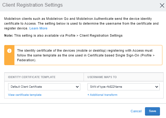 Select the username mapping in the certificate appropriately and click Save. For more information, see Client Registration Settings.