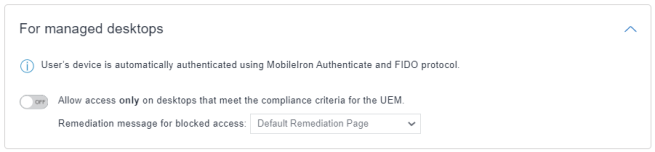 - For managed desktops: Users device is automatically authenticated using Authenticate and FIDO2 protocol. Enable the toggle switch to select this configuration.