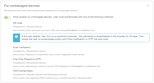 - For unmanaged devices: Enable the toggle switch to allow access on unmanaged devices. Users are authenticated with one of the following methods: QR code, Push notification, One Time Password (OTP), and FIDO Authenticator.