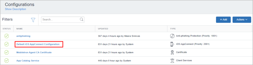 MobileIron provides the default configurations needed to quickly set up and distribute AppConnect apps to devices. MobileIron provides the following default configurations for AppConnect for iOS: