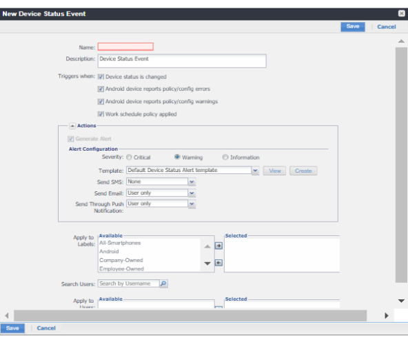Associate this event with the selected labels. See the “Using labels to establish groups” section in the Core MobileIron Getting Started Guide for more information.